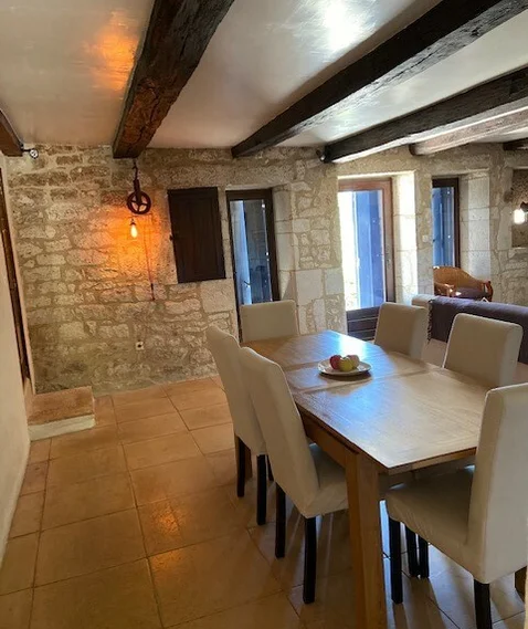 In the dining room there are a table and chairs. You can make the table smaller or larger as you wish. A bite to eat, a nice place for the kids to color or play quietly, etc. The table is multifunctional.